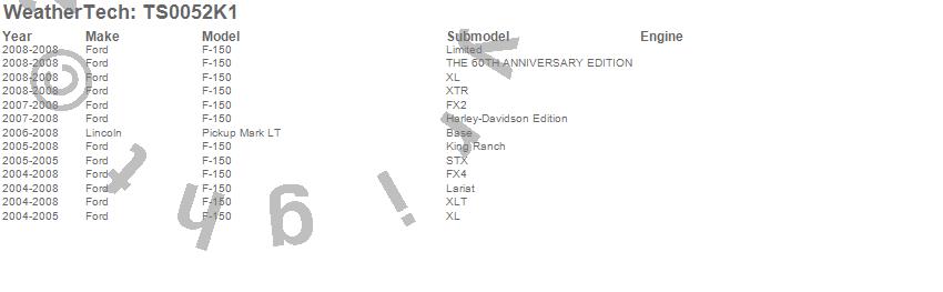 Below is an abbreviated list of applications for the WeatherTech SunShade Full Vehicle Kit.F-150, Mark LT, Ford, Lincoln, 2008, 2007, 2006, 2005, 2004