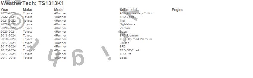 Below is an abbreviated list of applications for the WeatherTech SunShade Full Vehicle Kit.4Runner, Toyota, 2024, 2023, 2022, 2021, 2020, 2019, 2018, 2017