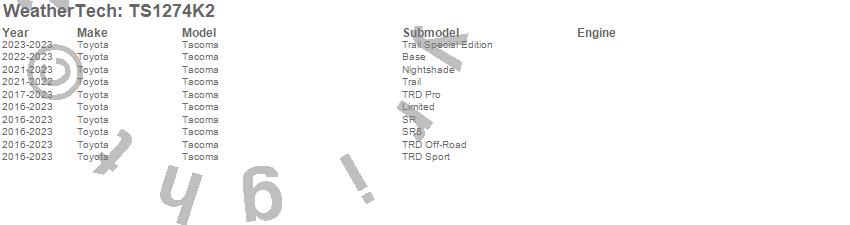Below is an abbreviated list of applications for the WeatherTech SunShade Full Vehicle Kit.Tacoma, Toyota, 2023, 2022, 2021, 2020, 2019, 2018, 2017, 2016