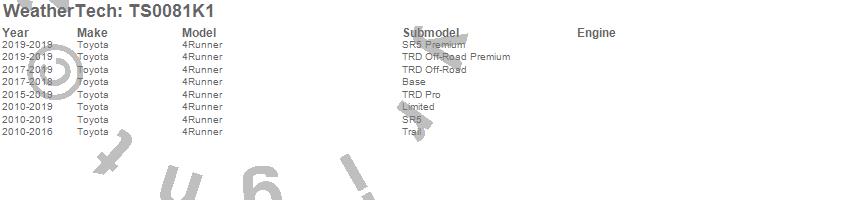 Below is an abbreviated list of applications for the WeatherTech SunShade Full Vehicle Kit.4Runner, Toyota, 2019, 2018, 2017, 2016, 2015, 2014, 2013, 2012, 2011, 2010
