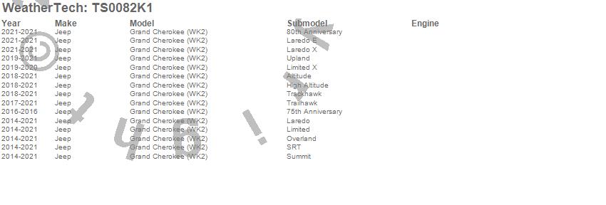 Below is an abbreviated list of applications for the WeatherTech SunShade Full Vehicle Kit.Grand Cherokee (WK2), Jeep, 2021, 2020, 2019, 2018, 2017, 2016, 2015, 2014