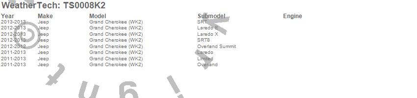 Below is an abbreviated list of applications for the WeatherTech SunShade Full Vehicle Kit.Grand Cherokee (WK2), Jeep, 2013, 2012, 2011