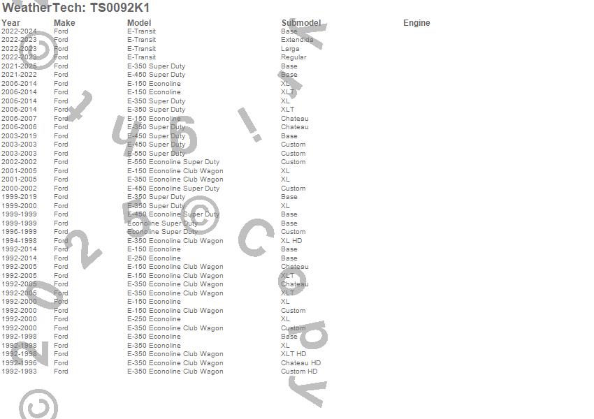 Below is an abbreviated list of applications for the WeatherTech SunShade Full Vehicle Kit.E-150 Econoline, E-150 Econoline Club Wagon, E-250 Econoline, E-350 Econoline, E-350 Econoline Club Wagon, E-350 Super Duty, E-450 Econoline Super Duty, E-450 Super Duty, E-550 Econoline Super Duty, E-550 Super Duty, E-Transit, Econoline Super Duty, Ford, 2026, 2025, 2024, 2023, 2022, 2021, 2019