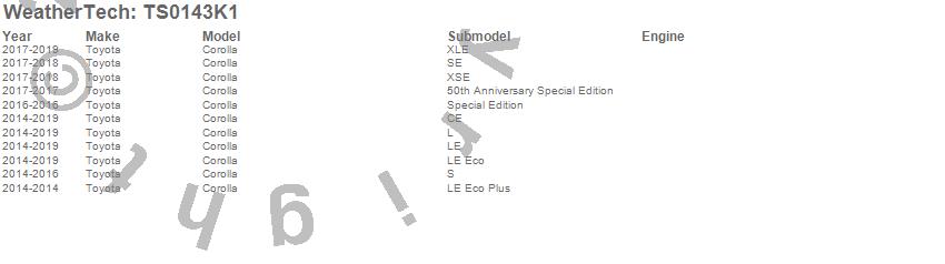 Below is an abbreviated list of applications for the WeatherTech SunShade Full Vehicle Kit.Corolla, Toyota, 2019, 2018, 2017, 2016, 2015, 2014