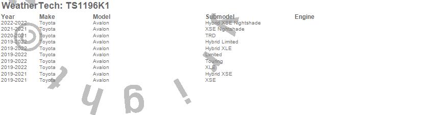 Below is an abbreviated list of applications for the WeatherTech SunShade Full Vehicle Kit.Avalon, Toyota, 2022, 2021, 2020, 2019