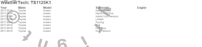 Below is an abbreviated list of applications for the WeatherTech SunShade Full Vehicle Kit.Avalon, Toyota, 2018, 2017, 2016