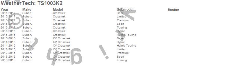 Below is an abbreviated list of applications for the WeatherTech SunShade Full Vehicle Kit.Crosstrek, XV Crosstrek, Subaru, 2017, 2016, 2015, 2014, 2013