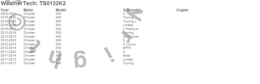 Below is an abbreviated list of applications for the WeatherTech SunShade Full Vehicle Kit.300, Chrysler, 2023, 2022, 2021, 2020, 2019, 2018, 2017, 2016, 2015, 2014, 2013, 2012, 2011