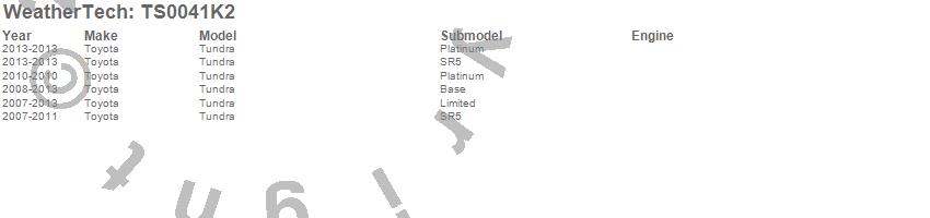 Below is an abbreviated list of applications for the WeatherTech SunShade Full Vehicle Kit.Tundra, Toyota, 2013, 2012, 2011, 2010, 2009, 2008, 2007