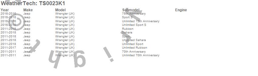 Below is an abbreviated list of applications for the WeatherTech SunShade Full Vehicle Kit.Wrangler (JK), Jeep, 2018, 2017, 2016, 2015, 2014, 2013, 2012, 2011