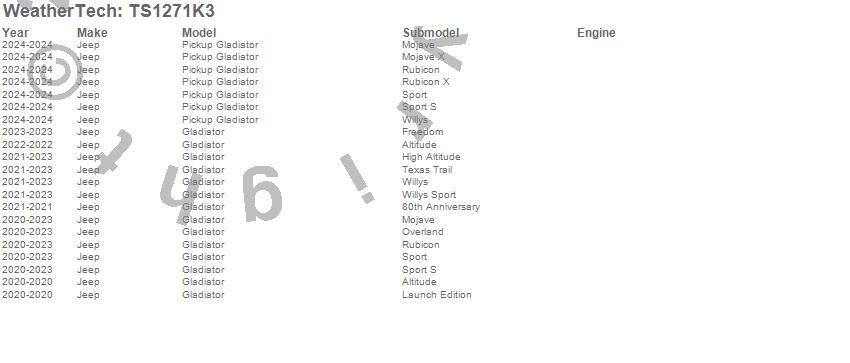 Below is an abbreviated list of applications for the WeatherTech SunShade Full Vehicle Kit.Gladiator, Pickup Gladiator, Jeep, 2026, 2025, 2024, 2023, 2022, 2021, 2020