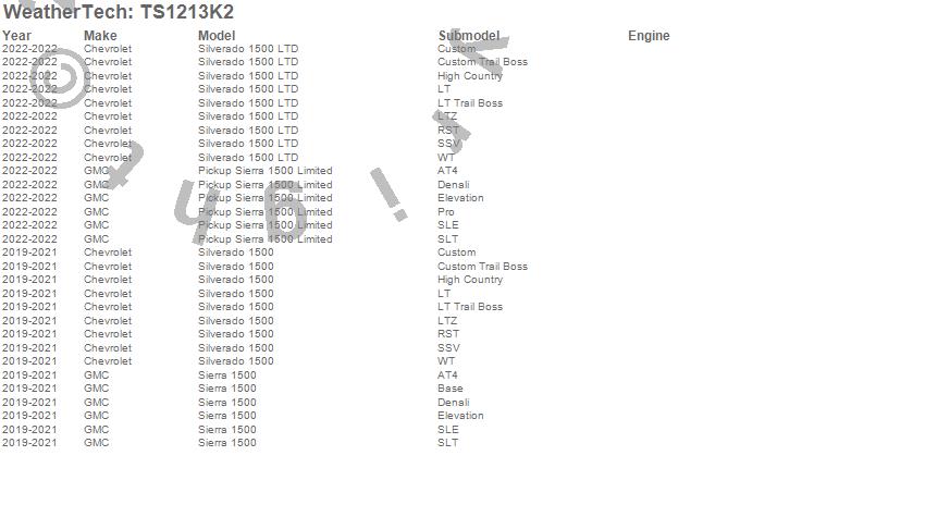 Below is an abbreviated list of applications for the WeatherTech SunShade Full Vehicle Kit.Pickup Sierra 1500 Limited, Sierra 1500, Silverado 1500, Silverado 1500 LTD, Chevrolet, GMC, 2022, 2021, 2020, 2019
