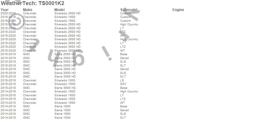 Below is an abbreviated list of applications for the WeatherTech SunShade Full Vehicle Kit.Sierra 1500, Sierra 2500 HD, Sierra 3500 HD, Silverado 1500, Silverado 2500 HD, Silverado 3500 HD, Chevrolet, GMC, 2020, 2019, 2018, 2017, 2016, 2015, 2014