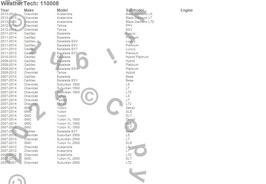 Below is an abbreviated list of applications for the MudFlap No-Drill DigitalFit.Avalanche, Escalade, Escalade ESV, Escalade EXT, Suburban 1500, Suburban 2500, Tahoe, Yukon, Yukon XL 1500, Yukon XL 2500, Cadillac, Chevrolet, GMC, 2014, 2013, 2012, 2011, 2010, 2009, 2008
