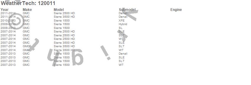 Below is an abbreviated list of applications for the MudFlap No-Drill DigitalFit.Sierra 1500, Sierra 2500 HD, Sierra 3500 HD, GMC, 2014, 2013, 2012, 2011, 2010, 2009, 2008, 2007