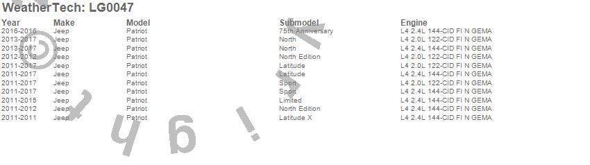 Below is an abbreviated list of applications for the LampGard.Patriot, Jeep, 2017, 2016, 2015, 2014, 2013, 2012, 2011