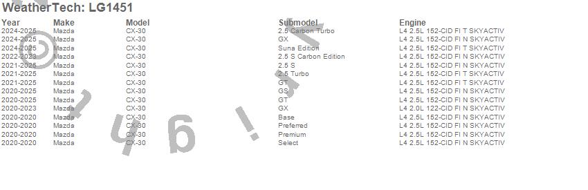Below is an abbreviated list of applications for the LampGard.CX-30, Mazda, 2025, 2024, 2023, 2022, 2021, 2020
