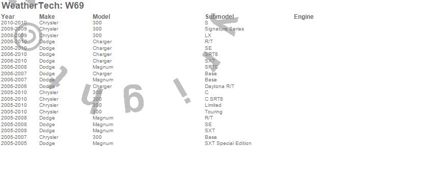 Below is an abbreviated list of applications for the All Weather Floor Mats.300, Charger, Magnum, Chrysler, Dodge, 2010, 2009, 2008, 2007, 2006, 2005