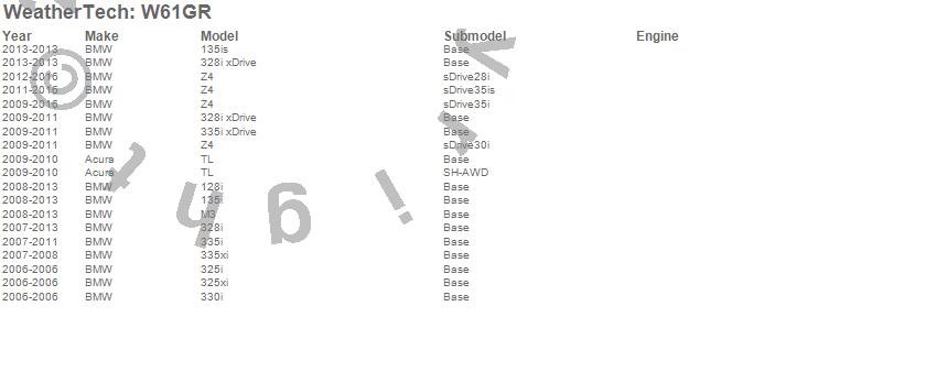 Below is an abbreviated list of applications for the All Weather Floor Mats.128i, 135i, 135is, 325i, 325xi, 328i, 328i xDrive, 330i, 335i, 335i xDrive, 335xi, M3, TL, Z4, Acura, BMW, 2016, 2015, 2014, 2013