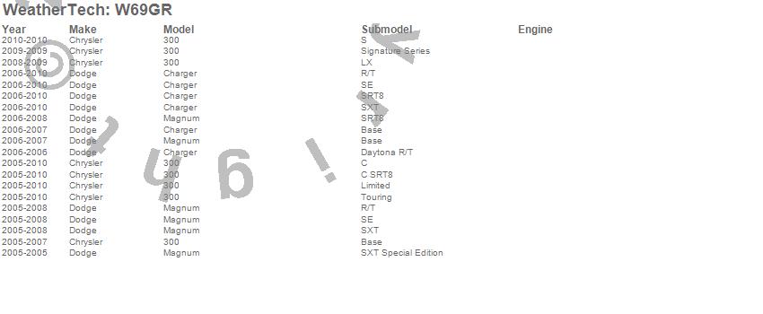 Below is an abbreviated list of applications for the All Weather Floor Mats.300, Charger, Magnum, Chrysler, Dodge, 2010, 2009, 2008, 2007, 2006, 2005