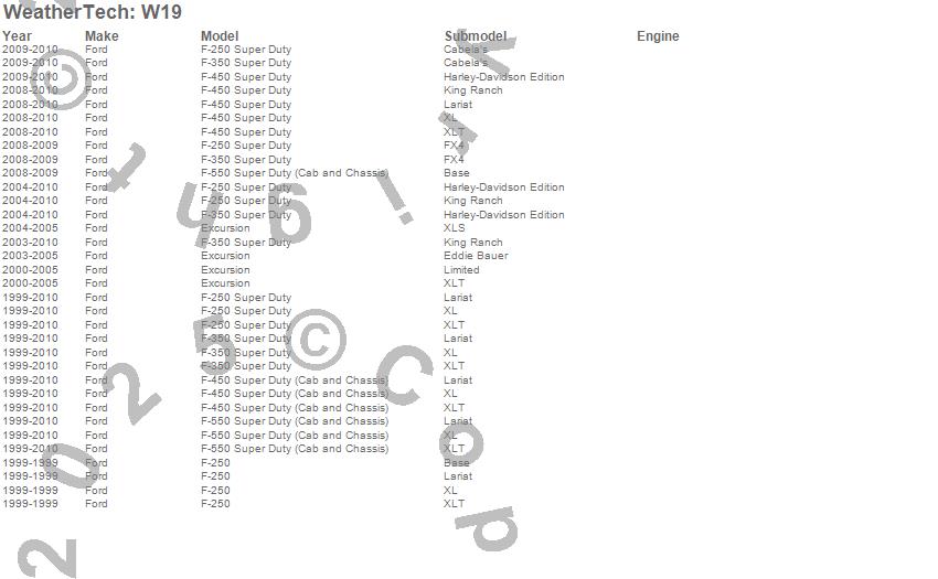 Below is an abbreviated list of applications for the All Weather Floor Mats.Excursion, F-250, F-250 Super Duty, F-350 Super Duty, F-450 Super Duty, F-550 Super Duty, Ford, 2010, 2009, 2008, 2007, 2006, 2005, 2004, 2003, 2002, 2001, 2000, 1999