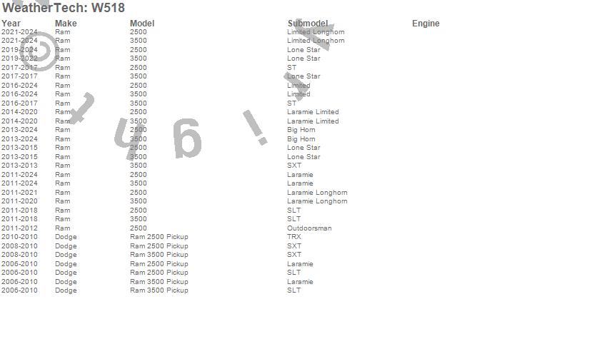 Below is an abbreviated list of applications for the All Weather Floor Mats.2500, 3500, Ram 2500, Ram 3500, Dodge, Ram, 2024, 2023, 2022, 2021, 2020, 2019, 2018, 2017, 2016, 2015, 2014, 2013, 2012, 2011