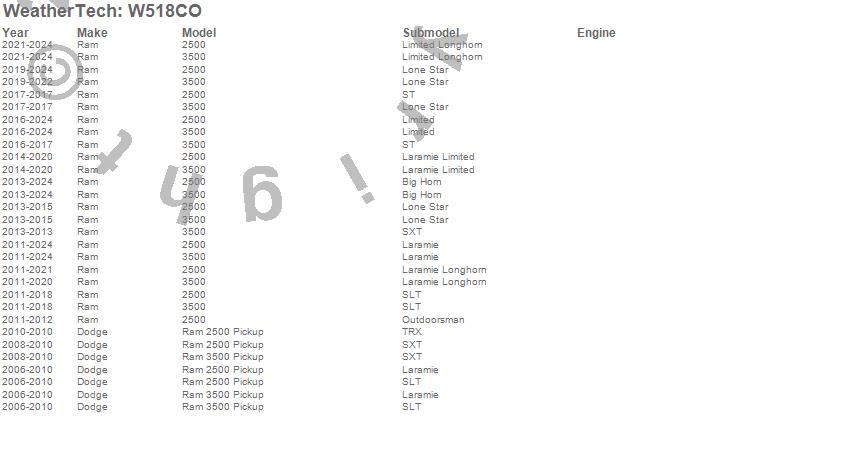 Below is an abbreviated list of applications for the All Weather Floor Mats.2500, 3500, Ram 2500, Ram 3500, Dodge, Ram, 2024, 2023, 2022, 2021, 2020, 2019, 2018, 2017, 2016, 2015, 2014, 2013, 2012, 2011