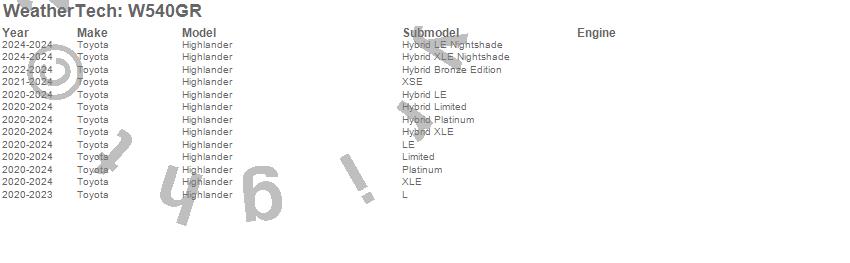 Below is an abbreviated list of applications for the All Weather Floor Mats.Highlander, Toyota, 2025, 2024, 2023, 2022, 2021, 2020