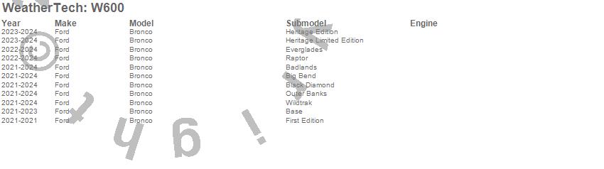 Below is an abbreviated list of applications for the All Weather Floor Mats.Bronco, Ford, 2025, 2024, 2023, 2022, 2021