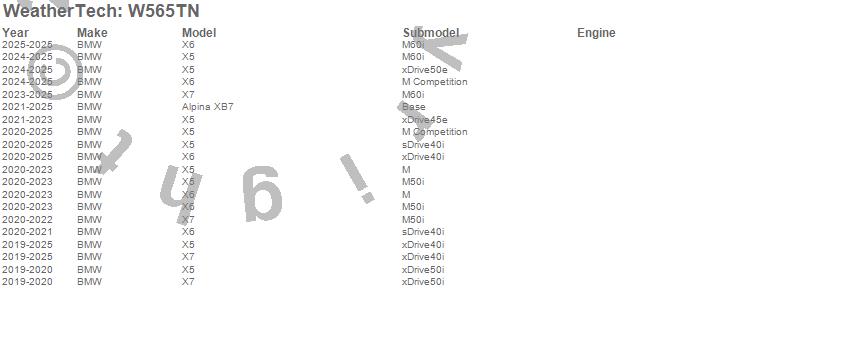 Below is an abbreviated list of applications for the All Weather Floor Mats.Alpina XB7, X5, X6, X7, BMW, 2025, 2024, 2023, 2022, 2021, 2020, 2019