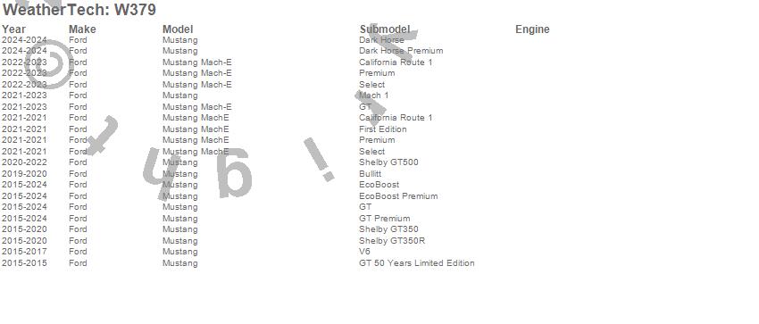 Below is an abbreviated list of applications for the All Weather Floor Mats.Mustang, Mustang Mach-E, Mustang MachE, Ford, 2026, 2025, 2024, 2023, 2022, 2021, 2020, 2019, 2018, 2017, 2016, 2015