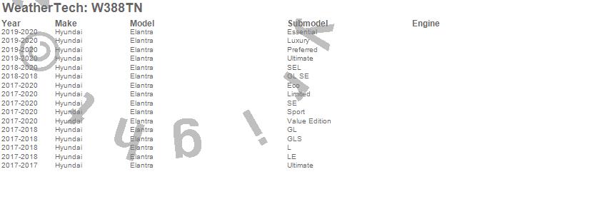 Below is an abbreviated list of applications for the All Weather Floor Mats.Elantra, Hyundai, 2020, 2019, 2018, 2017