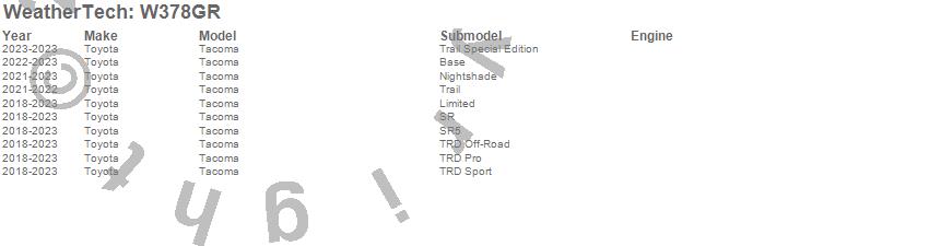 Below is an abbreviated list of applications for the All Weather Floor Mats.Tacoma, Toyota, 2023, 2022, 2021, 2020, 2019, 2018