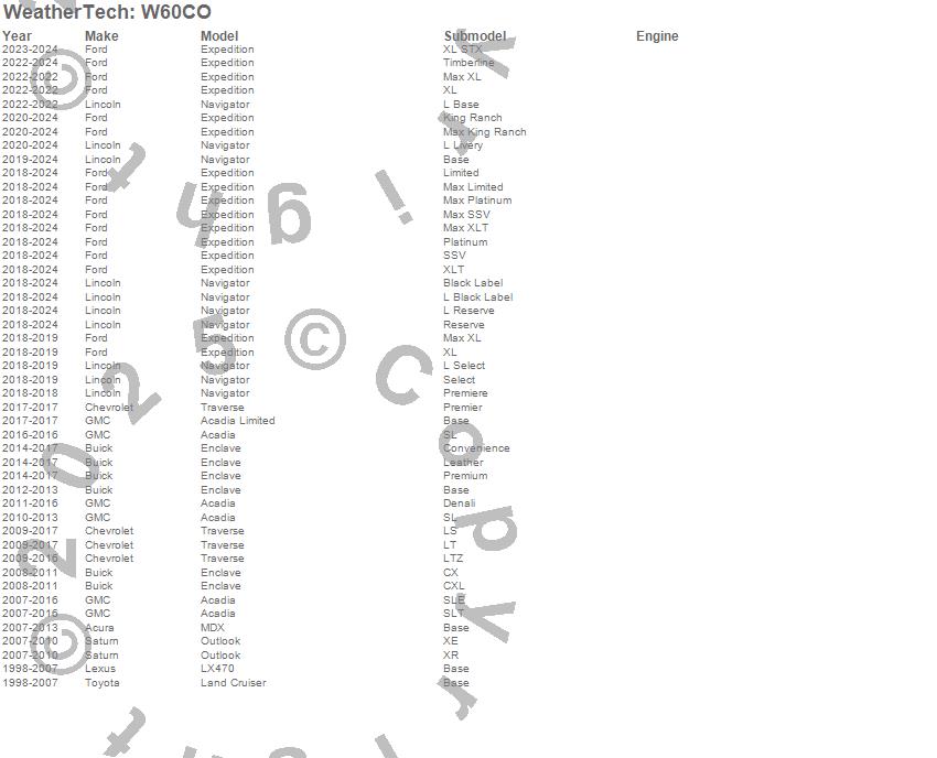 Below is an abbreviated list of applications for the All Weather Floor Mats.Acadia, Acadia Limited, Enclave, Expedition, Land Cruiser, LX470, MDX, Navigator, Outlook, Traverse, Acura, Buick, Chevrolet, Ford, GMC, Lexus, Lincoln, Saturn, Toyota, 2024