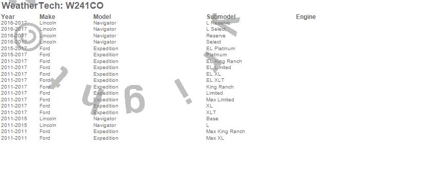 Below is an abbreviated list of applications for the All Weather Floor Mats.Expedition, Navigator, Ford, Lincoln, 2017, 2016, 2015, 2014, 2013, 2012, 2011