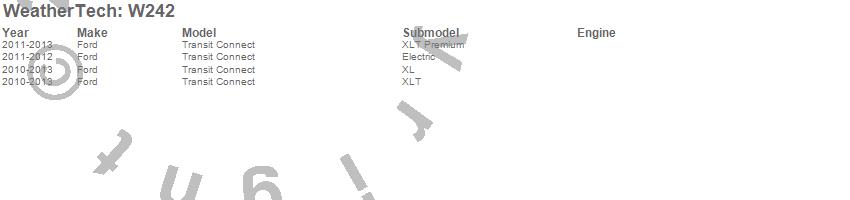 Below is an abbreviated list of applications for the All Weather Floor Mats.Transit Connect, Ford, 2013, 2012, 2011, 2010
