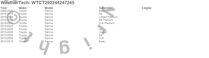 Below is an abbreviated list of applications for the All Weather Floor Mats.Sienna, Toyota, 2020, 2019, 2018, 2017, 2016, 2015, 2014, 2013