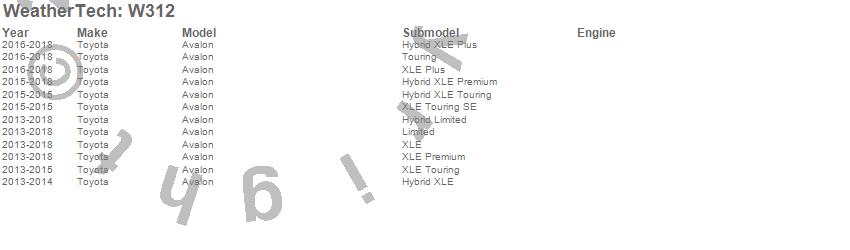 Below is an abbreviated list of applications for the All Weather Floor Mats.Avalon, Toyota, 2018, 2017, 2016, 2015, 2014, 2013
