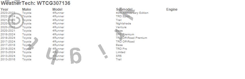 Below is an abbreviated list of applications for the All Weather Floor Mats.4Runner, Toyota, 2024, 2023, 2022, 2021, 2020, 2019, 2018, 2017, 2016, 2015, 2014, 2013