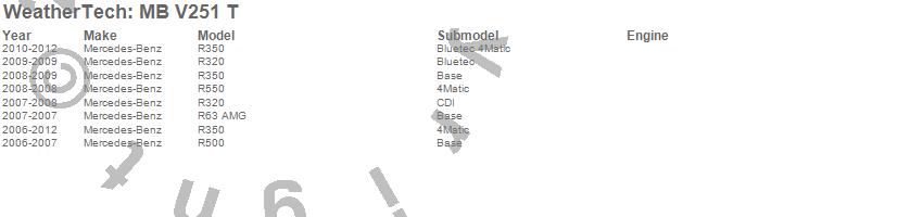 Below is an abbreviated list of applications for the All Weather Floor Mats.R320, R350, R500, R550, R63 AMG, Mercedes-Benz, 2012, 2011, 2010, 2009, 2008, 2007, 2006