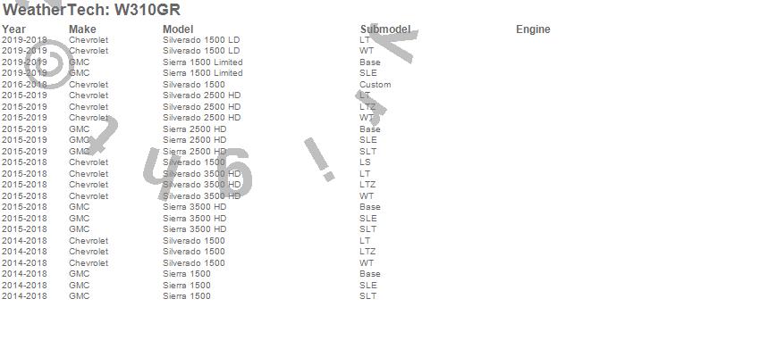 Below is an abbreviated list of applications for the All Weather Floor Mats.Sierra 1500, Sierra 1500 Limited, Sierra 2500 HD, Sierra 3500 HD, Silverado 1500, Silverado 1500 LD, Silverado 2500 HD, Silverado 3500 HD, Chevrolet, GMC, 2019, 2018, 2017, 2016, 2015, 2014