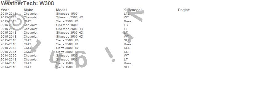 Below is an abbreviated list of applications for the All Weather Floor Mats.Sierra 1500, Sierra 2500 HD, Sierra 3500 HD, Silverado 1500, Silverado 2500 HD, Silverado 3500 HD, Chevrolet, GMC, 2020, 2019, 2018, 2017, 2016, 2015, 2014