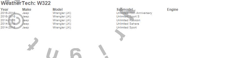 Below is an abbreviated list of applications for the All Weather Floor Mats.Wrangler (JK), Jeep, 2018, 2017, 2016, 2015, 2014