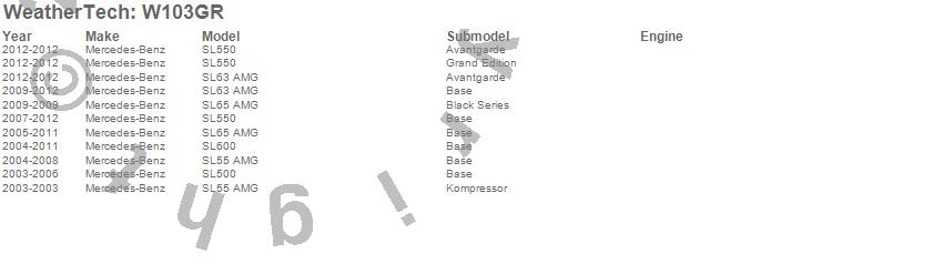 Below is an abbreviated list of applications for the All Weather Floor Mats.SL500, SL55 AMG, SL550, SL600, SL63 AMG, SL65 AMG, Mercedes-Benz, 2012, 2011, 2010, 2009, 2008, 2007, 2006, 2005, 2004, 2003
