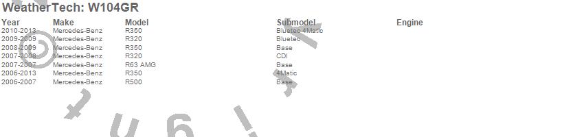 Below is an abbreviated list of applications for the All Weather Floor Mats.R320, R350, R500, R63 AMG, Mercedes-Benz, 2013, 2012, 2011, 2010, 2009, 2008, 2007, 2006