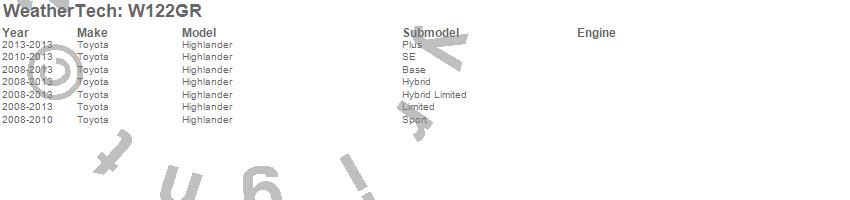 Below is an abbreviated list of applications for the All Weather Floor Mats.Highlander, Toyota, 2013, 2012, 2011, 2010, 2009, 2008