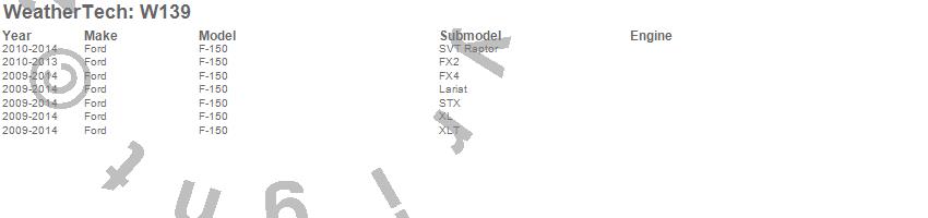 Below is an abbreviated list of applications for the All Weather Floor Mats.F-150, Ford, 2014, 2013, 2012, 2011, 2010, 2009