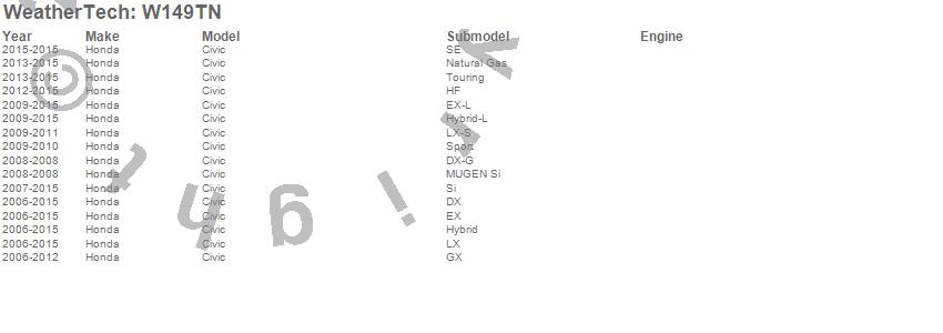 Below is an abbreviated list of applications for the All Weather Floor Mats.Civic, Honda, 2015, 2014, 2013, 2012, 2011, 2010, 2009, 2008, 2007, 2006