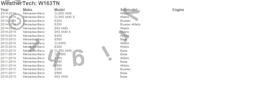 Below is an abbreviated list of applications for the All Weather Floor Mats.CLS550, CLS63 AMG, CLS63 AMG S, E250, E300, E350, E400, E550, E63 AMG, E63 AMG S, Mercedes-Benz, 2014, 2013, 2012, 2011, 2010