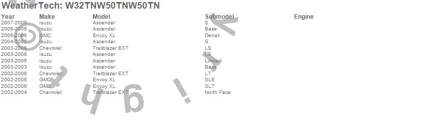 Below is an abbreviated list of applications for the All Weather Floor Mats.Ascender, Envoy XL, Trailblazer EXT, Chevrolet, GMC, Isuzu, 2008, 2007, 2006, 2005, 2004, 2003, 2002